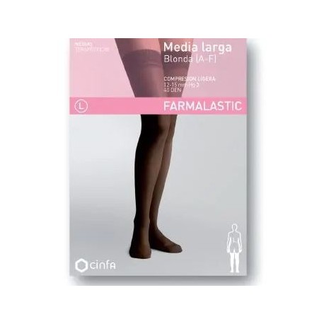 La media larga (A-F) Comp Ligera 40 Den de Farmalastic está diseñada para ofrecer una acción relajante frente a la sensación de fatiga y dolor en las piernas, así como para abordar problemas de circulación sanguínea superficial. Estas medias son indicadas para personas que pasan mucho tiempo de pie y para embarazadas que presentan síntomas leves de problemas circulatorios. La composición de esta prenda incluye un 85% de poliamida y un 15% de elastómeros.
