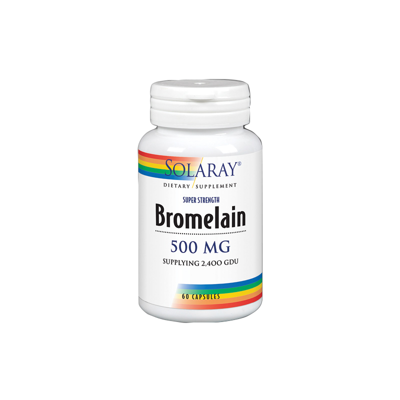 Solaray Bromelain es un complemento alimenticio de bromelaina. La bromelaina, que se extrae del tallo fresco de la piña, es conocida por su capacidad para mejorar las digestiones con alto contenido proteico y graso. Altas cantidades de esta enzima pueden inhibir la producción de algunas prostaglandinas, disminuyendo la inflamación en casos de inflamación articular y muscular. Además, estimula la producción de plasmina, que es capaz de romper el fibrinógeno presente en las inflamaciones localizadas, evitando así la formación de coágulos, siendo útil en personas con riesgo de trombosis o patologías cardíacas.